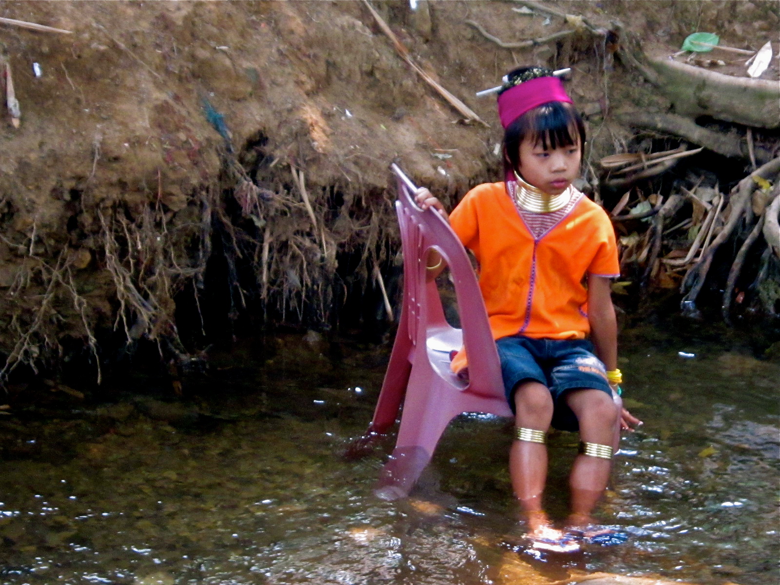 Following the market, we stopped at a small Kayan village. This small village was an offshoot of larger Kayan villages in the area. While I found this little girl playing in the river quite sweet, it seemed like this village was almost entirely created for tourists. We didn't see anyone doing anything but selling things from booths that were very similar to booths you would find at a craft fair. And--really--everything looked to be items you could purchase at the market we had just been to. But still, the items they were selling were very beautiful . . . I'm so drawn to all of the colors!