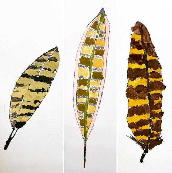 My Grade 4 students each created a feather using black markers and acrylic paint. The feathers were placed in a digital file and then printed on a scarf by Ms. Mallory at Rinnovo--isn't it beautiful?